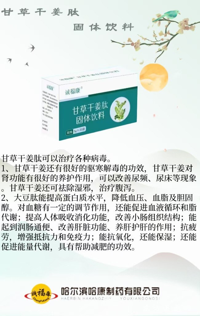 产品标签:祛风散寒、美容养颜、增强免疫力、降血脂、增强肠胃功能、减肥等功效。 配方来源于东汉张仲景《伤寒论》中的方剂甘草干姜汤。 干姜是温中散寒,甘草可以补气、解百毒、止咳平喘,这两样简单的药材放在一起,就可以祛寒湿、防疫毒、增强免疫力。 甘草干姜肽固体饮料的功效
